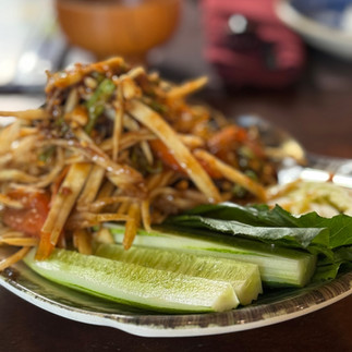Well, the was the steamed green Coconut filled with Amok Fish Curry, a huge bowl of Proherl Soup with lots of fresh and healthy greens, a green Papaya Salad with Salted Crab, and a plate of Laotian Lab ... four entrees for the two of us ... needless to say, we had leftovers.